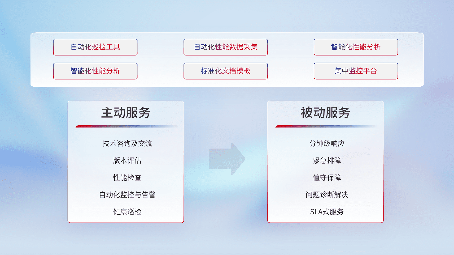 智能化工具和标准化文档,,保障服务质量,,提供主动服务(包含技术咨询、、、版本评估、、性能检查、、、、自动化监控与告警、、、健康巡检)和被动服务包含(分钟级响应、、、紧急排障、、、值守保障、、、、问题诊断解决、、SLA服务)。。。